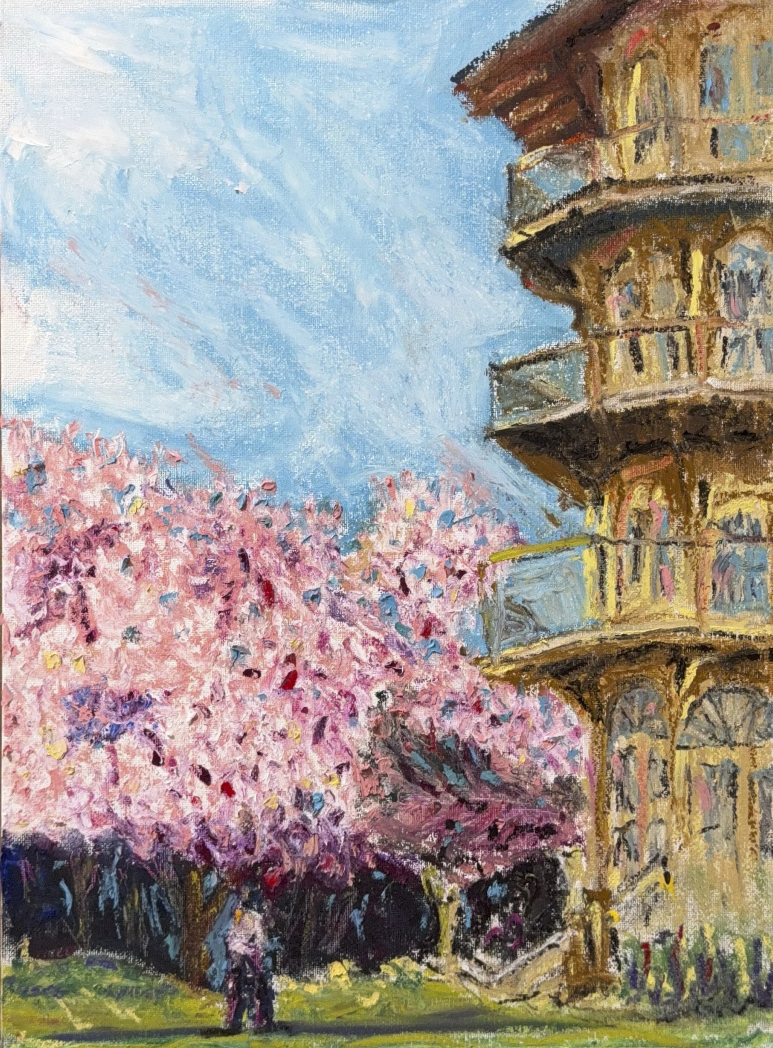 Some subjects choose you. I've returned to the Patterson Park Pagoda again and again: on film, on digital, in medium format, in oils with a palette knife, in watercolor, in gouache. Each time it gives me something different. This time, surrounded by cherry blossoms and rendered in oil pastels, it gave me warmth and explosion and light. A familiar landmark seen, once again, for the first time.