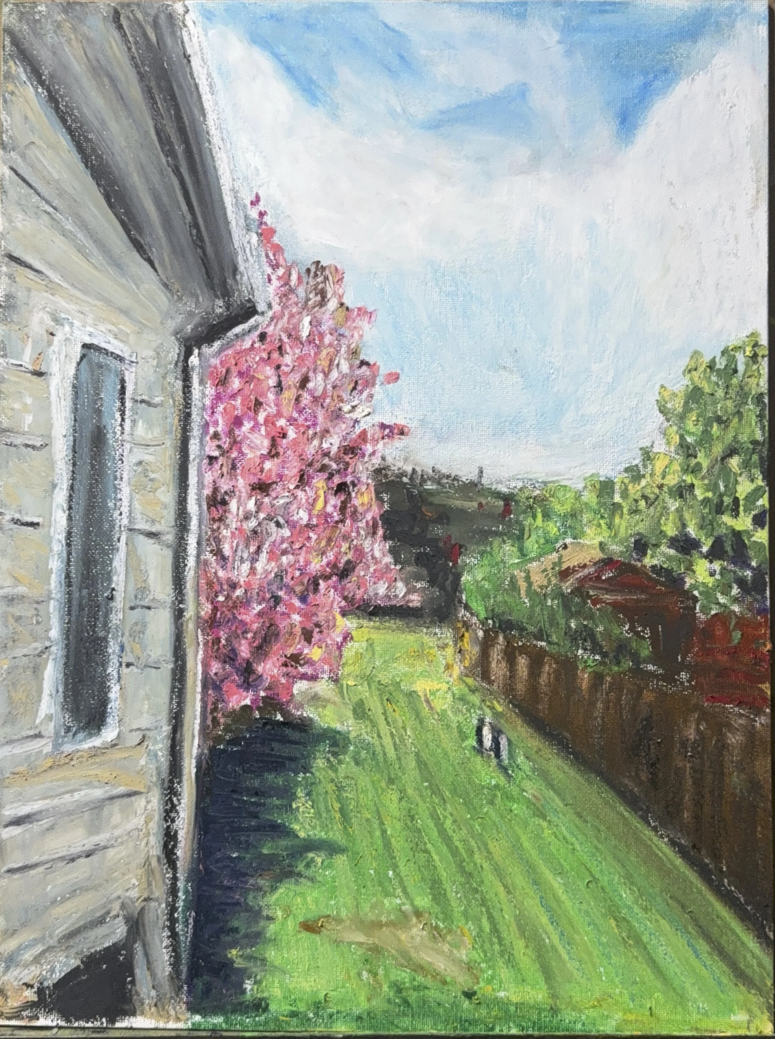 A backyard in full spring bloom. Pink blossoms against weathered wood, green lawn, open sky. The kind of scene that only reveals itself when you've finally stopped rushing. This study is a small portrait of a place where I learned to welcome solitude.