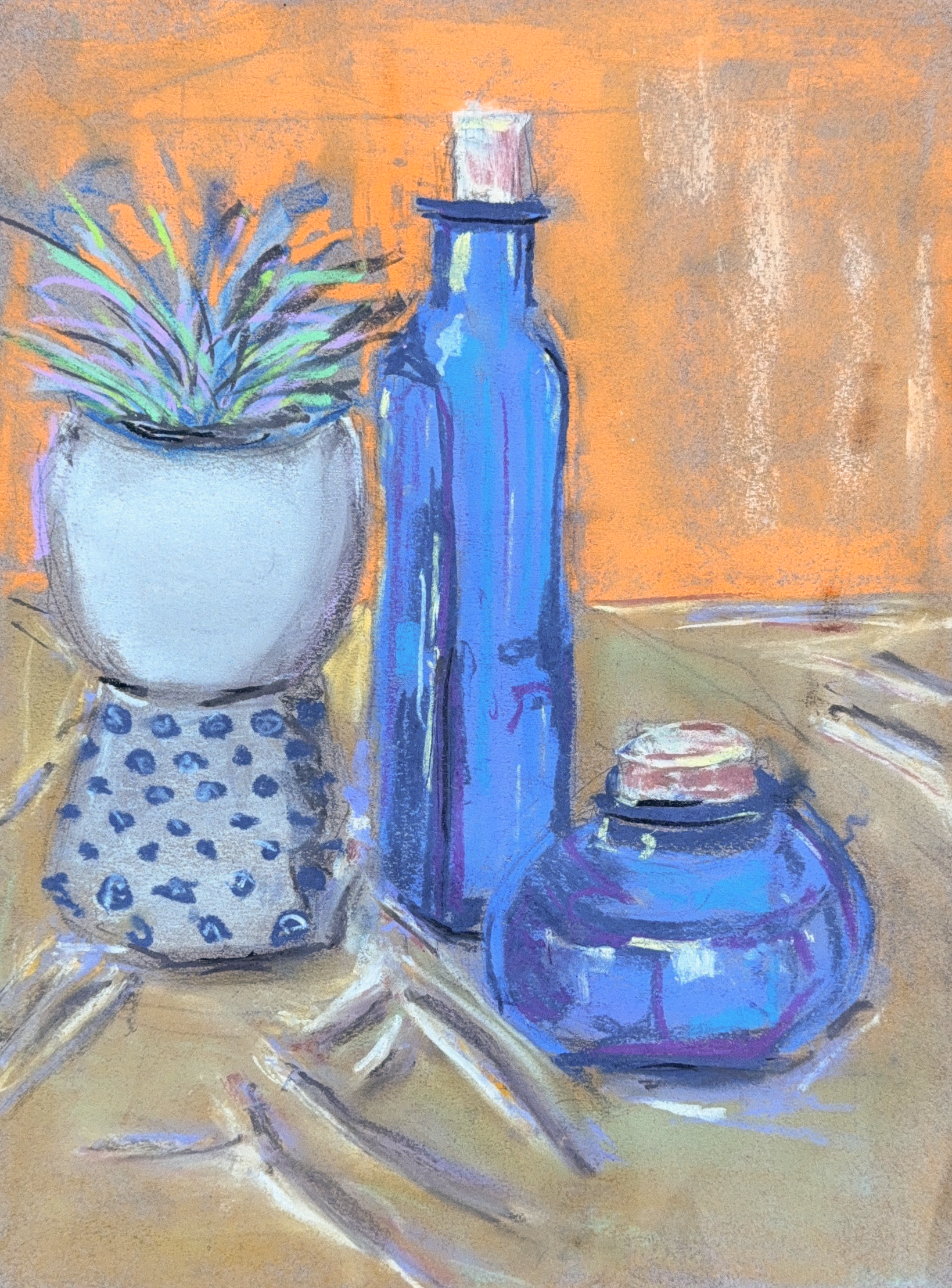 Still life study exploring glass transparency and surface quality in soft pastels. The challenge here was rendering that distinct luminosity of cobalt blue glass while maintaining the tactile, gestural nature of the medium.