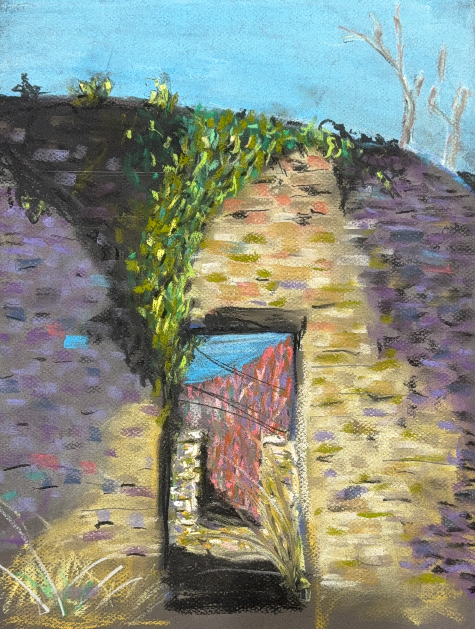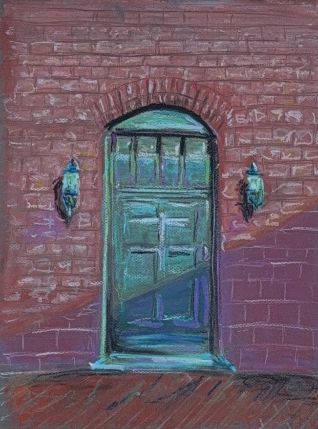 Soft pastel study exploring material contrast. A door in Fells Point, where decades of layers show themselves in texture and patina.
